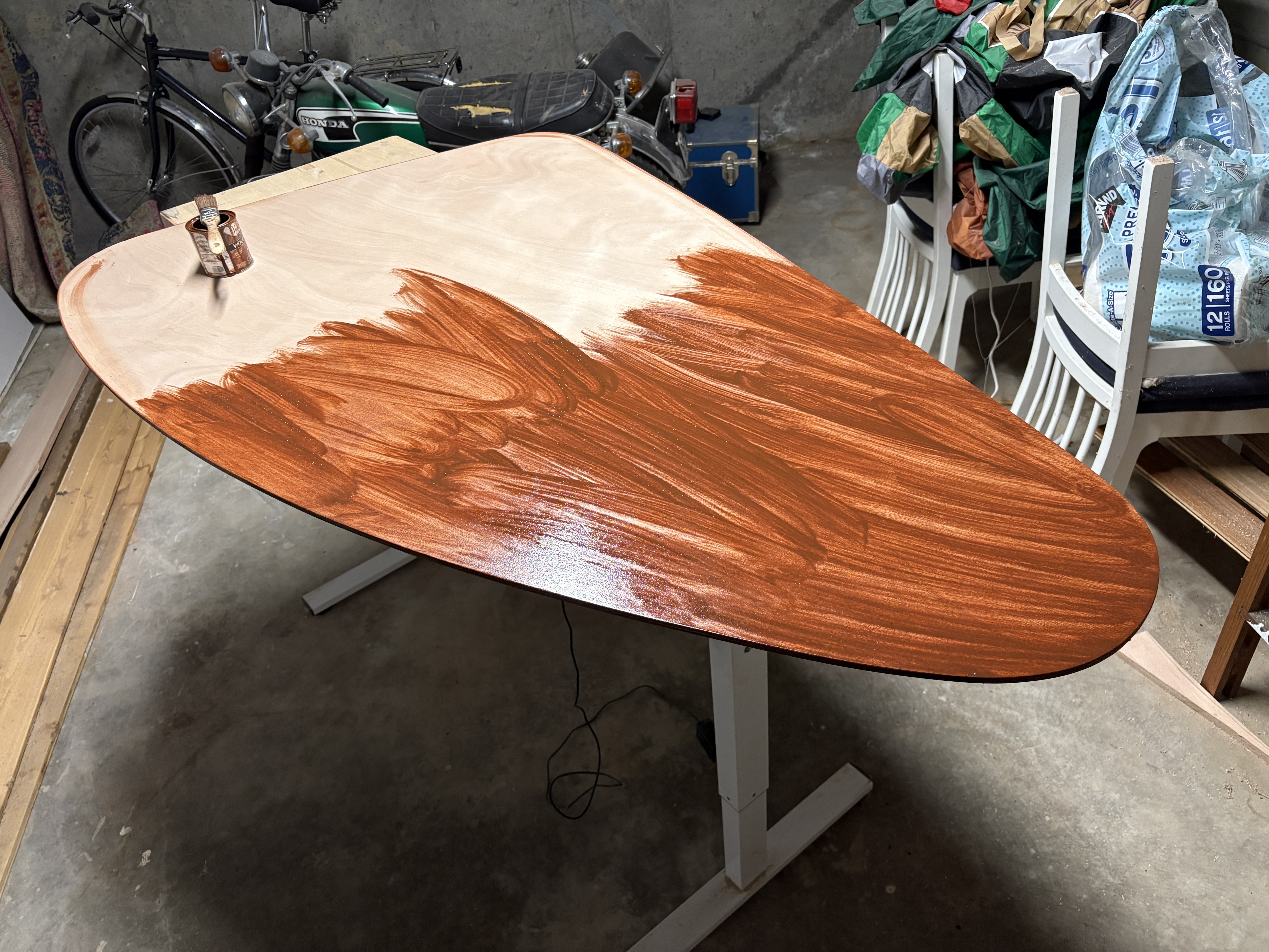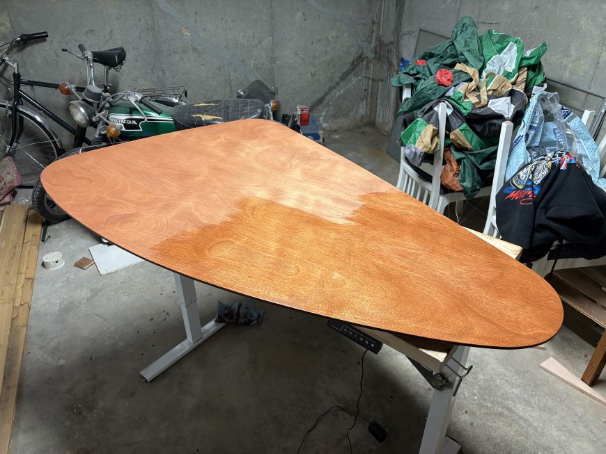 The plan was to get some plywood, cut it out with a jigsaw, and then use a tulip style base. Very easy. However I made a bit of a mistake at the hardware store. I assumed that the most expensive plywood they had ($130), made from most exotic sounding species I've ever hard of (African Okoume), would be a hardwood. Well it turns out that it's actually very soft, softer than hemlock. I was hoping to finish it with Rubio Monocoat for its superior protection from scratches and water damage, but it would have dented and gauged too easily, so I'll have to use polyurethan instead.
