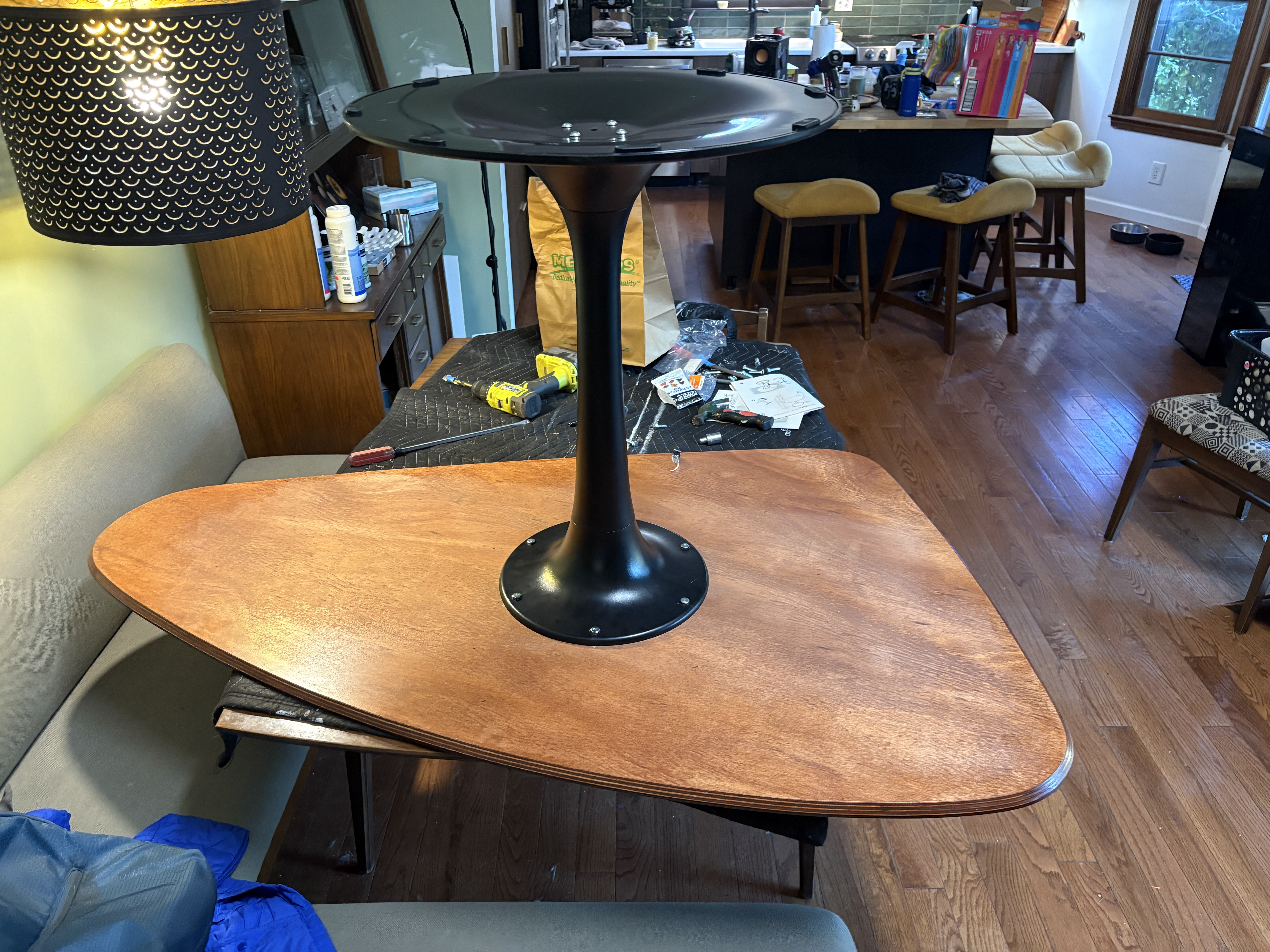 We knew this table really needed a tulip base, but that would have been very difficult for me to make. I would have needed an enormous wood lathe! But Ikea sells these, seperately from the table top, for only around $100.