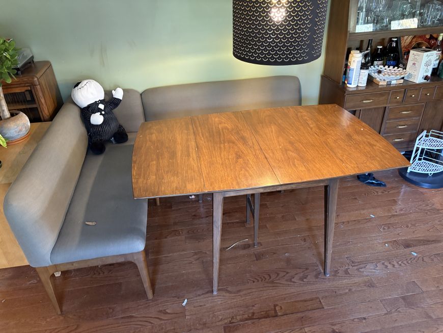 I haven't added a woodworking project to this blog in ages. But we needed a triangular-shaped dining table for our mid-century kitchen remodel. We bought a set of banquet style benches, but our rectangular dining table's legs made it hard to get in and out of the banquet benches, and it was also kind of messing with the flow through the room.